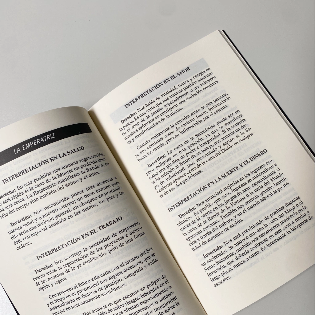 - Detalladas y comprensivas explicaciones de cada uno de los 22 arcanos mayores que facilitan una interpretación directa y práctica del Tarot.