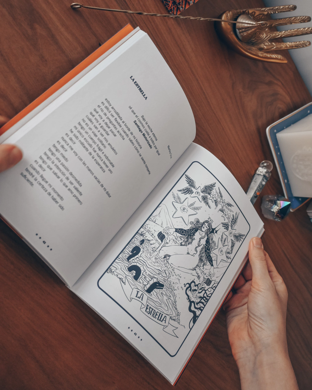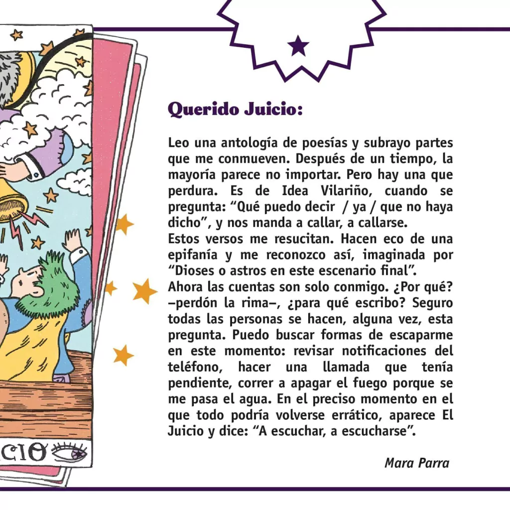 Este libro contiene 22 poemas y 22 ilustraciones inspirados en los arcanos mayores, además de una sección llamada "Querido tarot" con 22 cartas -escritas por Mara Parra- a cada uno de los arcanos..