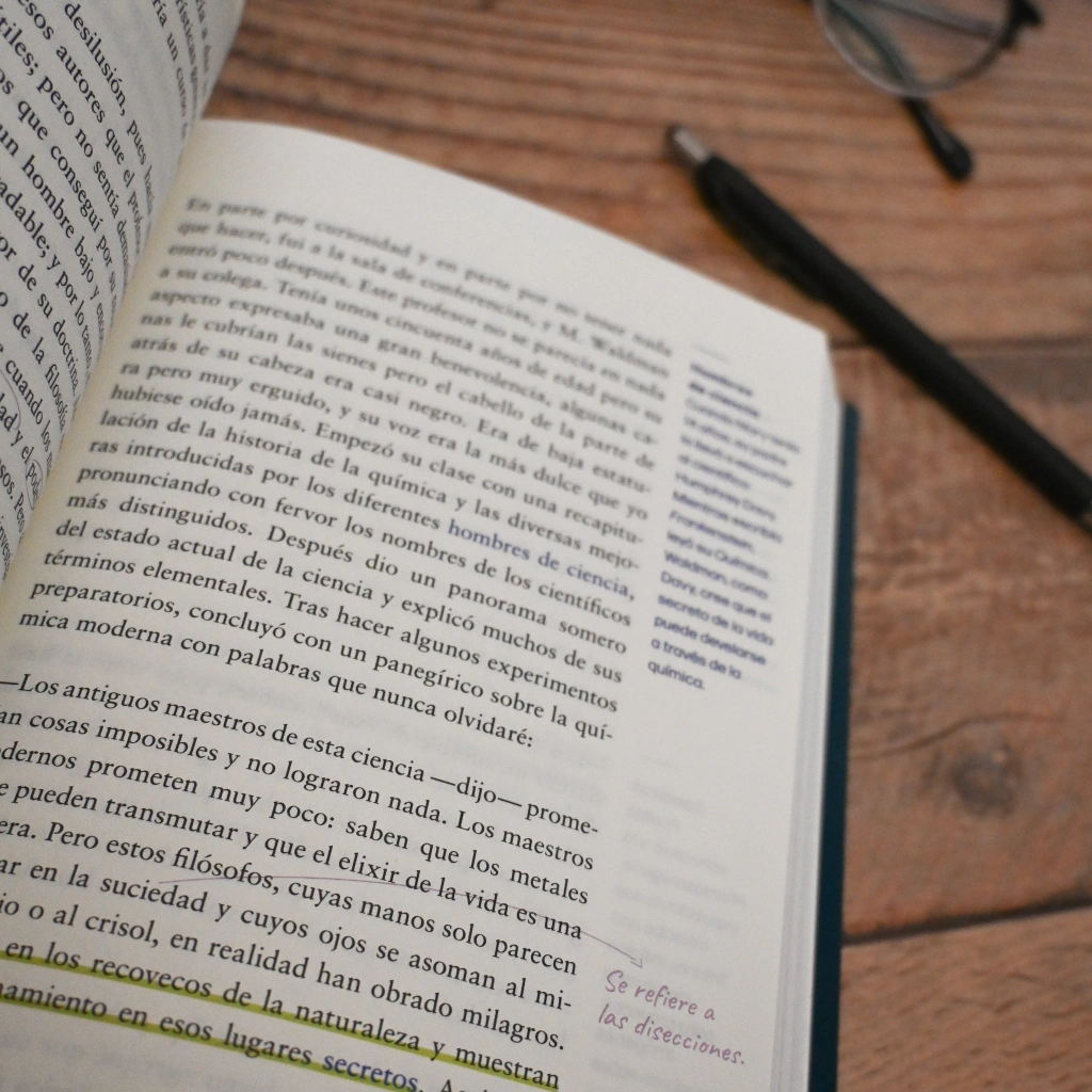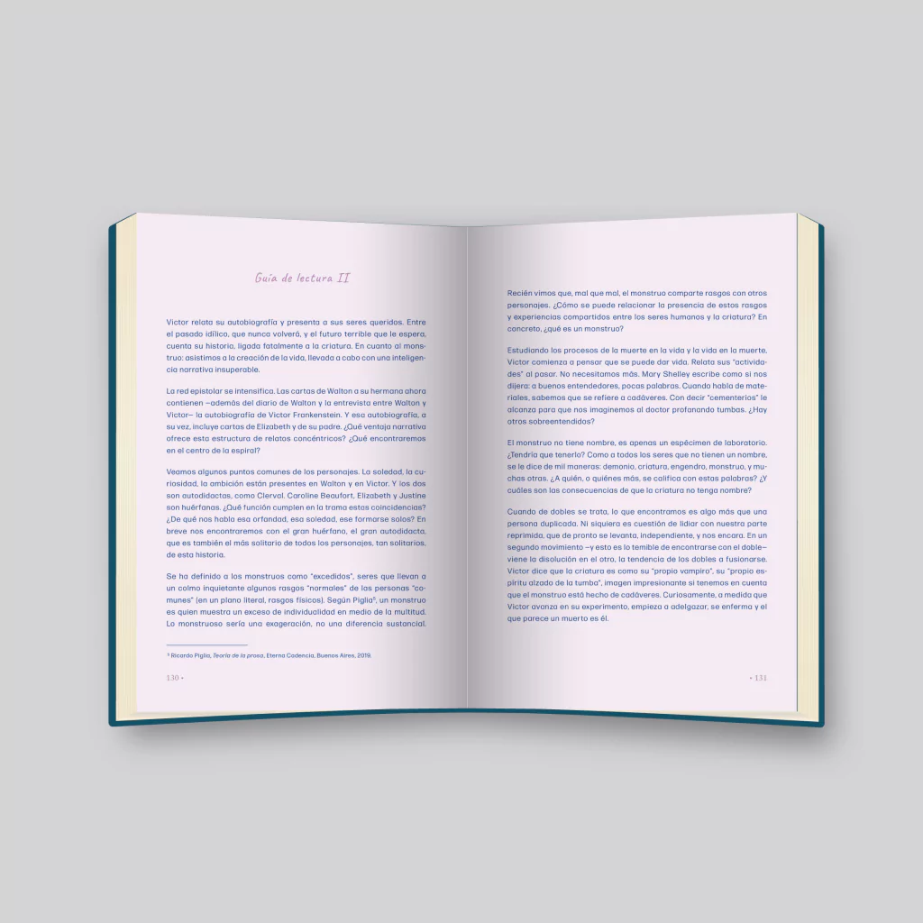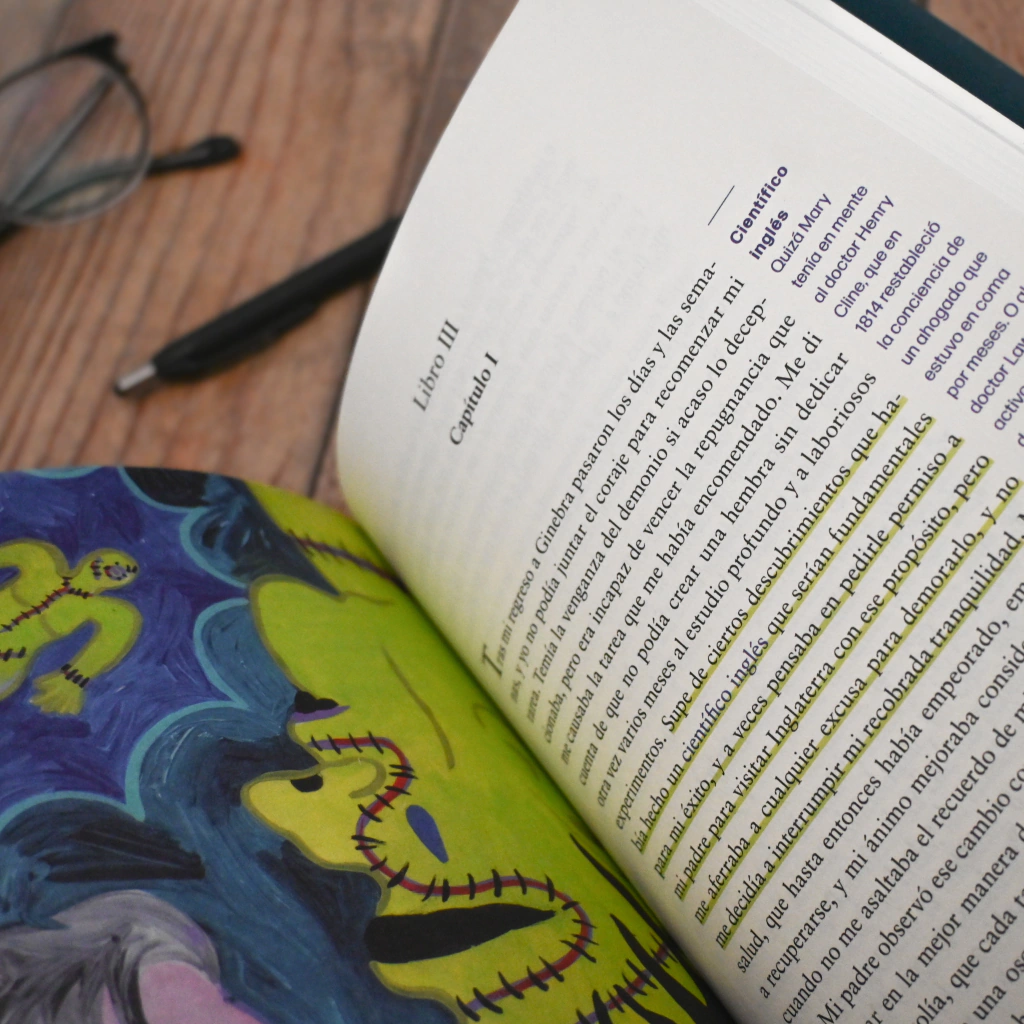 Esta edición (1818) cuenta con marcas de lectura como frases resaltadas; argumentos subrayados; conceptos clave circulados; notas al margen; guías de lectura al final de cada capítulo y un prólogo de Esther Cross que demuestra por qué el contexto de Mary fue propicio para la creación de Frankenstein. Además, incluye la introducción que agregó Shelley en la publicación de 1831. Leer así, es leer acompañadas.
