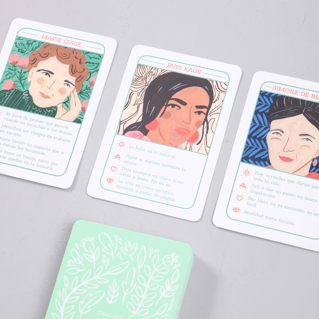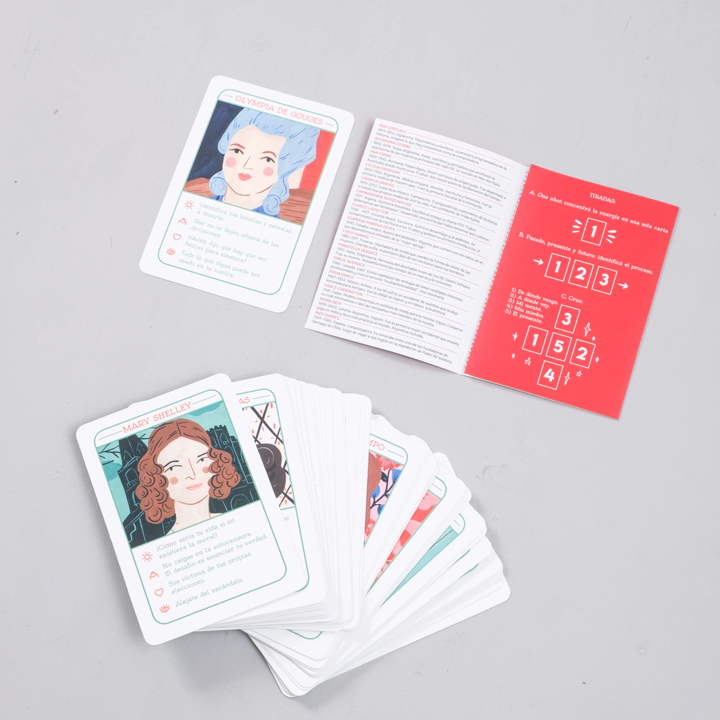 Este oráculo contiene 44 cartas ilustradas con mujeres de la historia que forman parte del libro de autoría colectiva “Mujeres autoras”. Frida Kahlo, J. K. Rowling, Virginia Woolf, Simone de Beauvoir, Alfonsina Storni y Clarice Lispector son algunas de las musas que nos acercan un mensaje para la vida; el trabajo o aula; el amor y también sobre un aprendizaje.