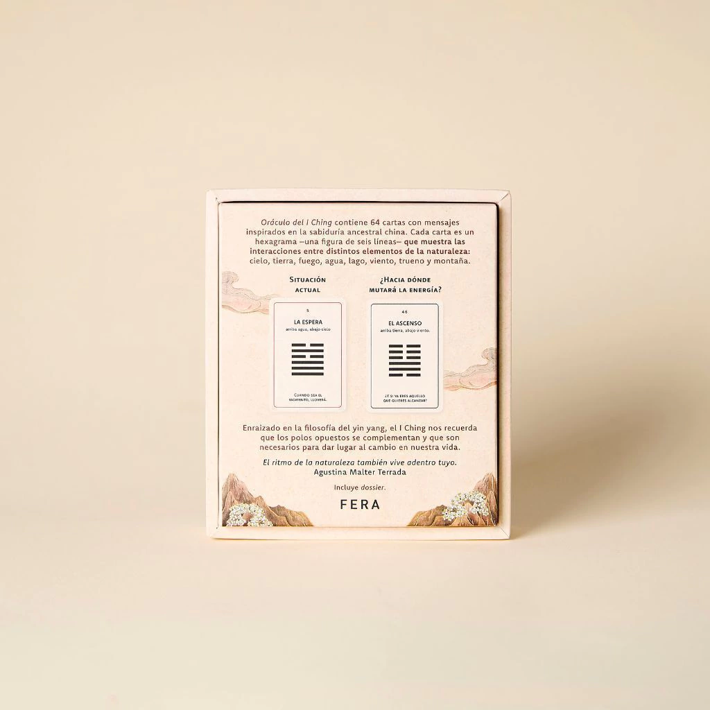 Oráculo del I Ching contiene 64 cartas con mensajes inspirados en la sabiduría ancestral china. Cada carta es un hexagrama –una figura de seis líneas– que muestra las interacciones entre distintos elementos de la naturaleza: cielo, tierra, fuego, agua, lago, viento, trueno y montaña. Enraizado en la filosofía del yin yang, el I Ching nos recuerda que los polos opuestos se complementan y que son necesarios para dar lugar al cambio en nuestra vida.