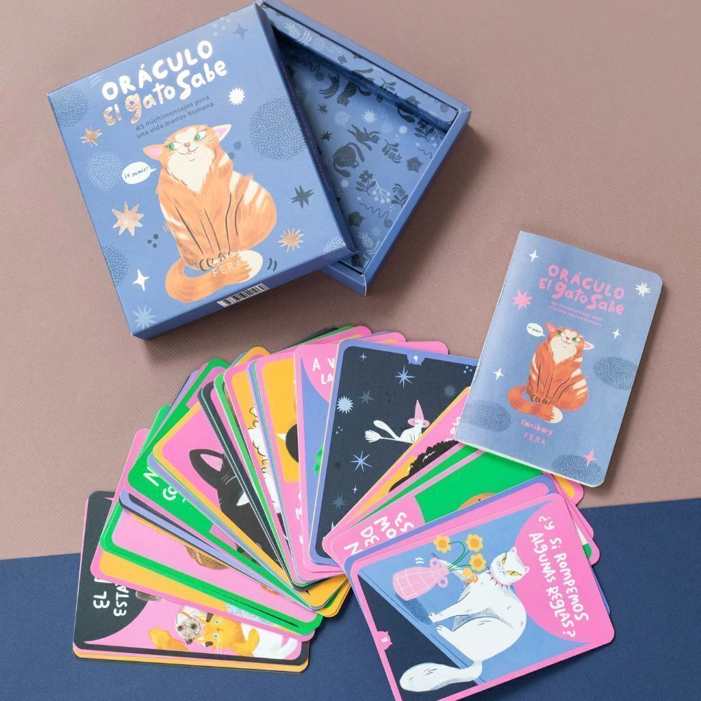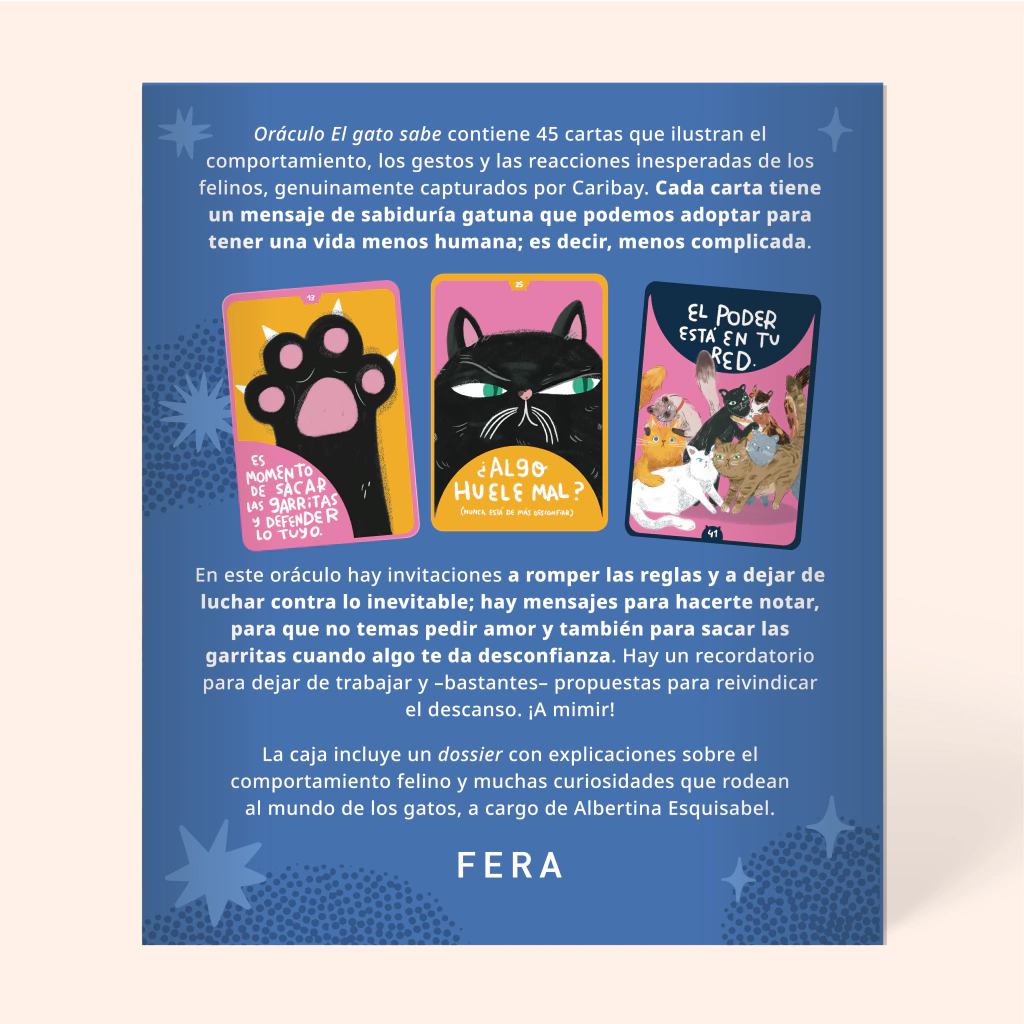 "Oráculo El gato sabe" contiene 45 cartas ilustradas con gestos y reacciones esperadas de los felinos. Las ilustraciones y los mensajes de sabiduría gatuna, fueron inspirados en los gatos de la autora: “Dude” y “El enano” para que podamos tener una vida menos humana, es decir menos complicada.