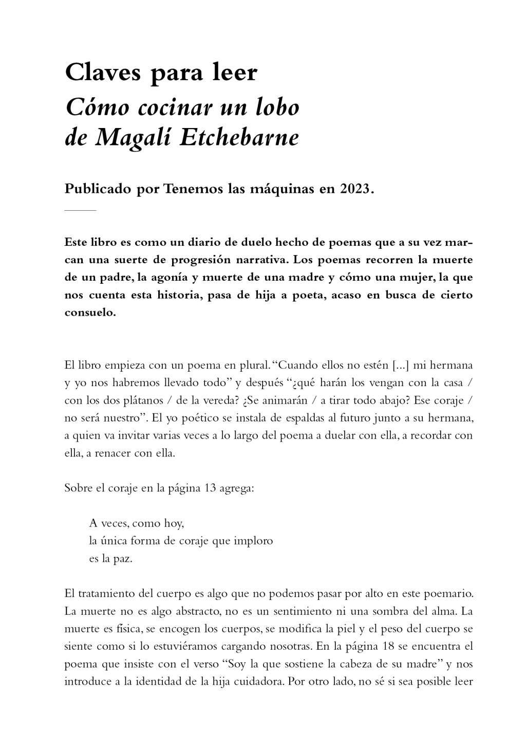 Una tarde muere y aparecen todas las preguntas pero también nuevas certezas. Es como aprender un lenguaje nuevo, el de la poesía. Ahora, Magalí Etchebarne tiene que desarmar la casa. Recorrerla de nuevo, una última vez, una vez más, vacía. Imposible no invocar a Anne Carson: “Si la prosa es una casa, la poesía es alguien en llamas corriendo a través de ella”. Pero, lo prefiera o no, este fuego está controlado. Es un fuego moderado por alguien que dispone de su propia desesperación.
