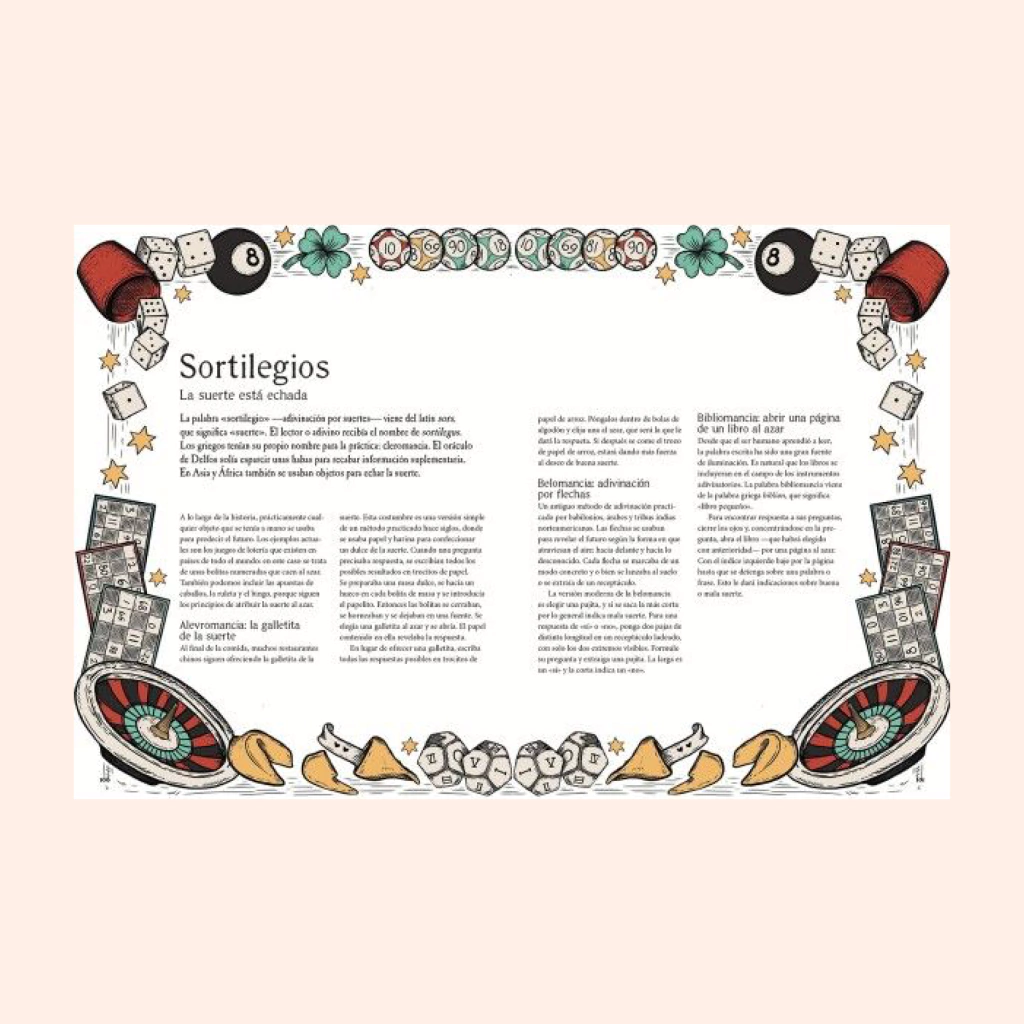 Es una guía para aprender más de 40 métodos adivinatorios, de los más conocidos a los más insólitos, entre ellos la astrología, la quiromancia, el tarot, la cefalomancia (lectura del cráneo) y la taseografía (lectura de las hojas del té).